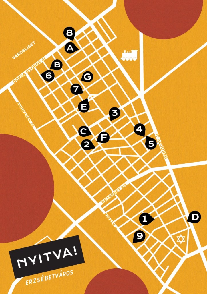 Ⓐ Kruz Bike Company Ⓑ MintaMókus Szövöde Ⓒ Sütipont Ⓓ Magvető Café Ⓔ Bethlen Téri Színház Ⓕ Antik Hang Ⓖ Szendvicsbár közösségi tér / Sandwich Bar community hub
