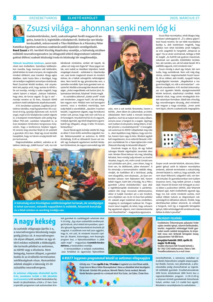 Reed Zsuzsa 48 éves volt, amikor megkapta az ADHD-ról és az autizmusról szóló diagnózisát. Egészen addig az volt a megélése, hogy ő a kivételesen magas intelligenciája ellenére „hülye”. Végül sok vargabetűt követően társaival együtt megalapította a Kisvilág neurodivergens-barát közösségi irodát és kapcsolódási teret, ahol ADHD-val és autizmussal élők is egy olyan békés szigetre találhatnak, ami minden részletében az ő igényeiket szolgálja. Mitől tud egy munkahely neurodivergens-barát lenni? Mit tehetnek a munkáltatók a neurodivergens kollégákért? Milyen hétköznapi nehézségekkel néz szembe egy autizmussal élő ember? Miért érdekes, hogy mi van a mazsolás zacskó hátoldalára írva? És mi az az ADHD-adó? Fiala Borcsa írása.